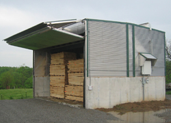 The deeper version of the modular delivered lumber kiln is placed on a 6ft high concrete wall. The kiln is 27ft wide inside allowing 5 rows of 4ft lumber bundles and 14ft high clearance. The reversible fan, heat, and venting system are customized for your specific needs.